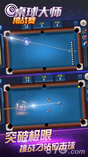 3、解锁专属的球杆,挑战各式关卡,磨砺自己的台球技术。