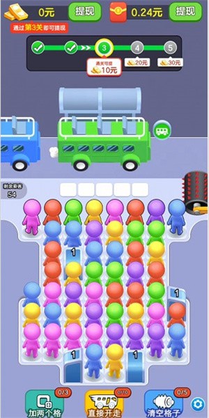 汽车大亨,一个很好玩的消除闯关游戏,玩家同将乘客放在相同颜色的车上来完成挑战,在汽车大亨中有很多关卡可以去体验,非常多的红包奖励等你去领取,有趣的关卡挑战会给你不同的乐趣,不断闯关领取属于你的奖励吧。