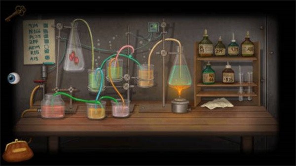 4、机器内,在桌子上得到胶带,去上面的房间,混合燃料。观察墙上的两幅图,是操作方法。先从右边的机器开始,