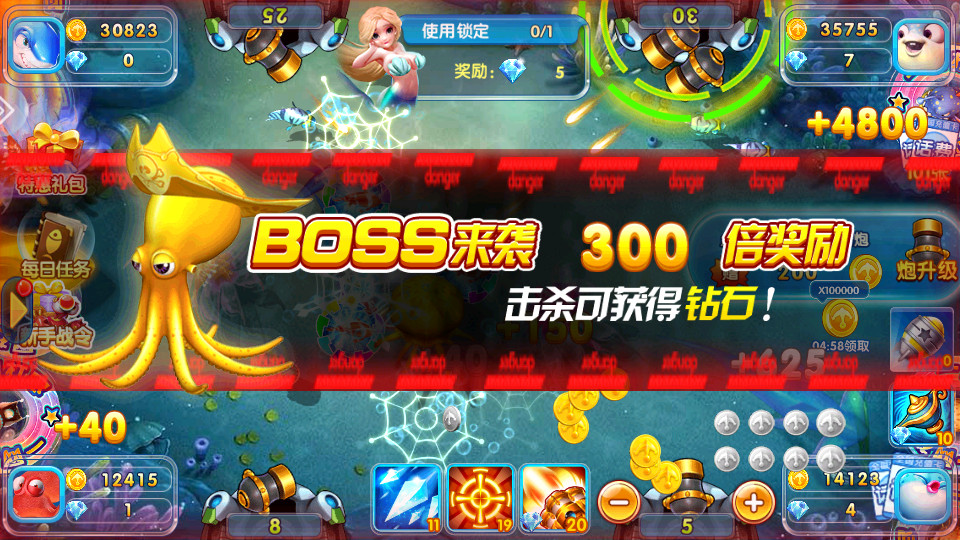 劲爽炫酷炮台和华丽绚烂翅膀,让您在海底的捕鱼世界也能炫出个性,惊艳四座!