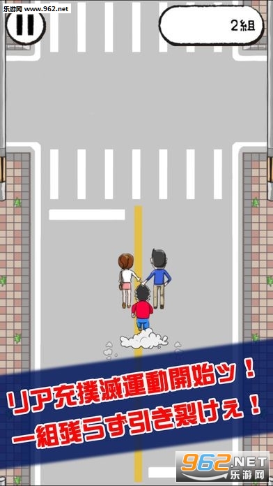 本作的玩法简单,即通过手指控制跑步的主角撞向敢在大街上牵手秀恩爱的情侣。可以看出本作充满宅男的调侃,怨念十足。平时苦于没有机会发泄对秀恩爱情侣不满的玩家可以在本游戏中得到很好的宽慰。喜欢这类游戏的玩家快来尝试吧。