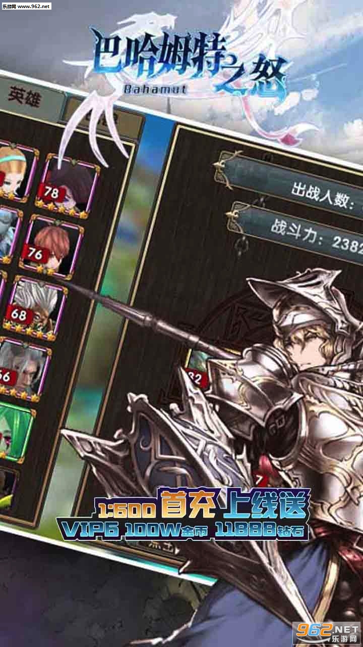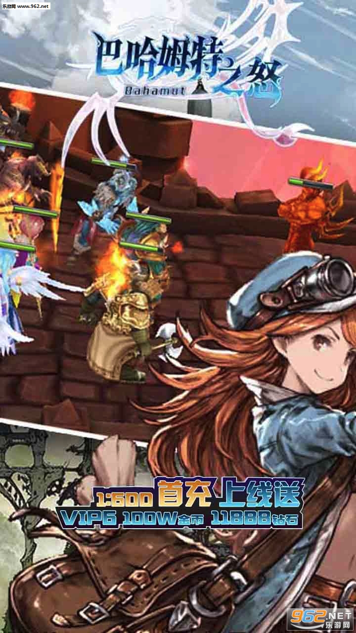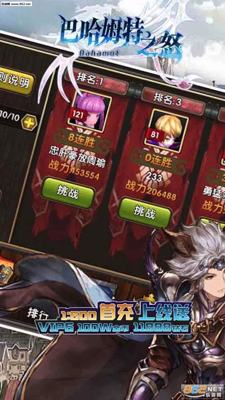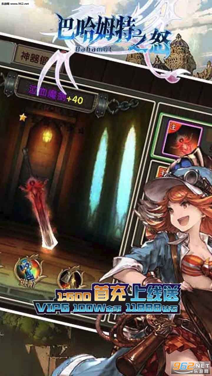 《巴哈姆特之怒》是一款回合制卡牌类手机游戏,登录即送VIP6,正常游戏五分钟即可获得妮娜,沙利尔等强力英雄。精彩绝伦的魔幻战斗画面,多种多样的阵容搭配,古典魔幻的地下城、血战模式,精彩的竞技场、巅峰神殿,奇妙的神器锻造之旅、武器锻造店和兽王秘境等众多副本,还有众多魔幻英雄美女在游戏中等待你,还在等什么,一起加入《巴哈姆特之怒》,体验属于你的魔幻游戏之旅!