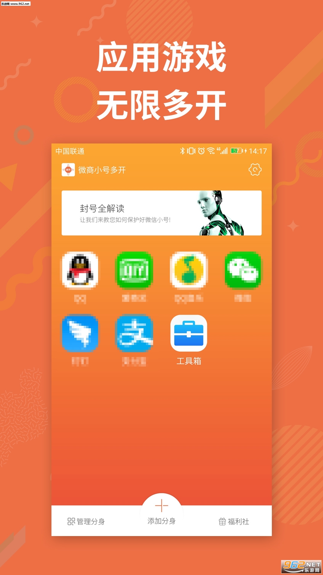 分身小号随便多开:神奇的核心技术虚拟系统,支持所有应用和游戏多开,分身数量不限,尽情玩。还有萌妹子客服手把手,一步步教你制作应用与游戏分身!