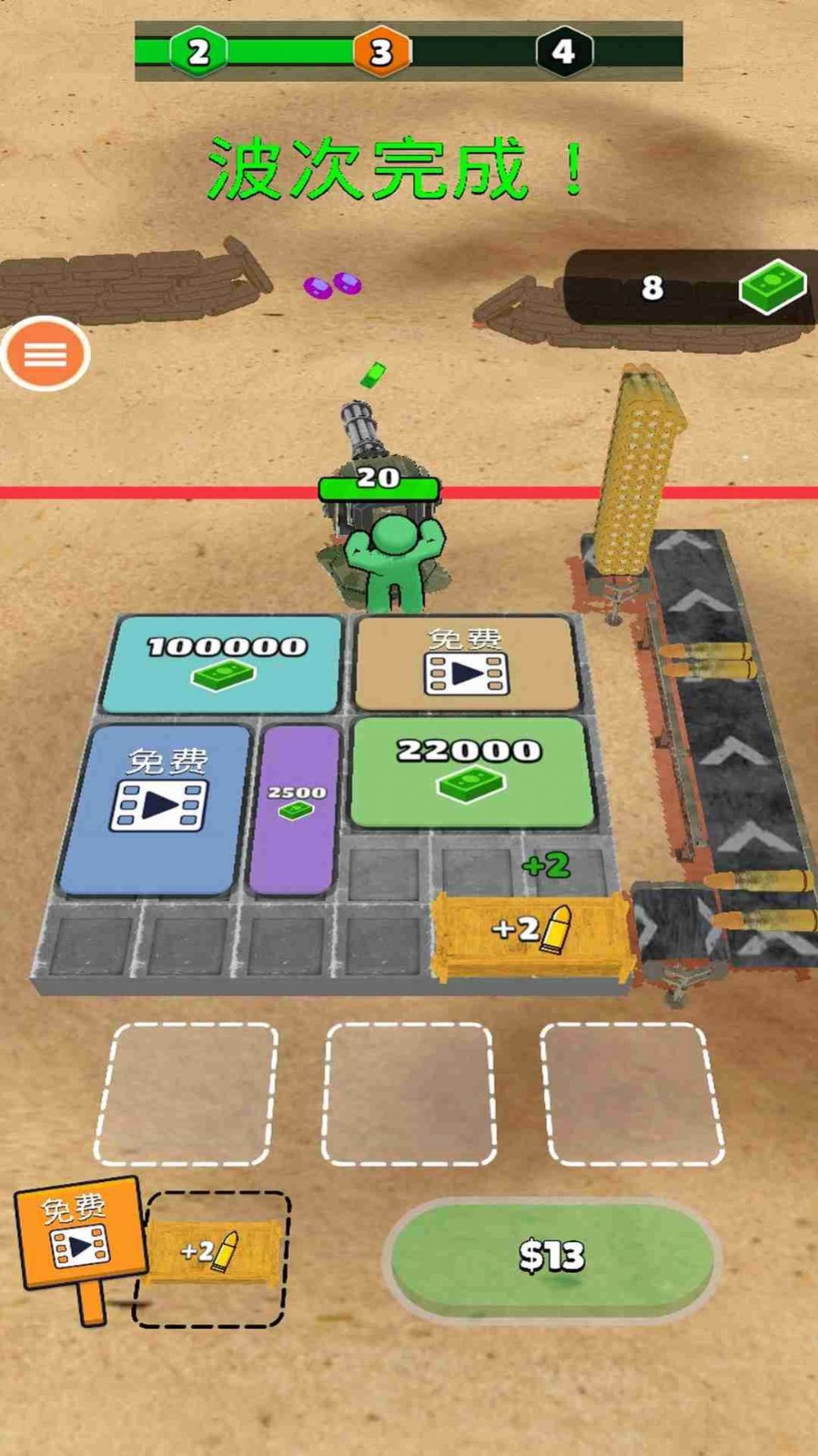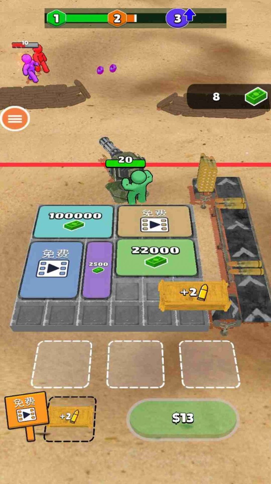 枪神狙击战游戏是一款好玩的射击竞技游戏,游戏中不断的升级你的武器,面对进攻的敌人击杀就有奖励,通过收集掉落在外面的金币升级炮塔,有很多选择能够帮助你强化武器,游戏中还有很多的炮位可以新增,召唤更多的火炮手进行进攻,随着关卡强度提升,难度也会增加很多,玩家要小心喽!