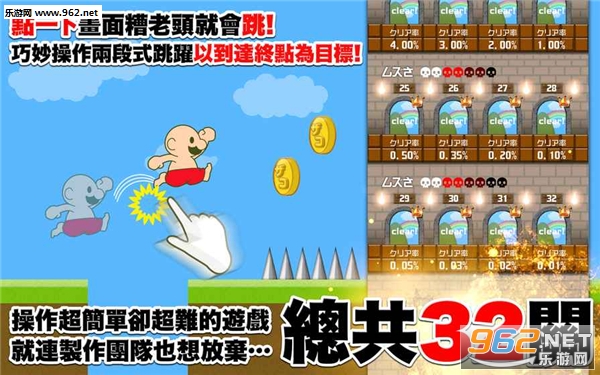 非常好玩的平台跳跃游戏。游戏画面诙谐,操作简单,乐趣多多。玩家将控制光头、大胡子的主角,利用跳跃和二段跳,挑战各种陷阱和障碍的关卡,目前有32个关卡。想挑战你的操作技巧吗,那就赶快加入游戏吧!