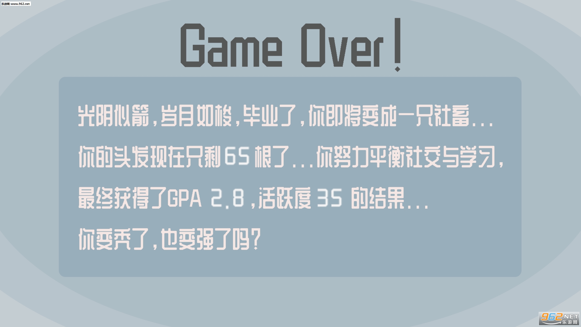 这是一个经营类养成系策略型小游戏,身为大学生的你需要在学业和社交中获得平衡。你会遇到作业DDL和其他锅(来自社团或者学生组织),完成这些事项都会使你掉发,但是不完成就会影响绩点(GPA)和校园活跃度。