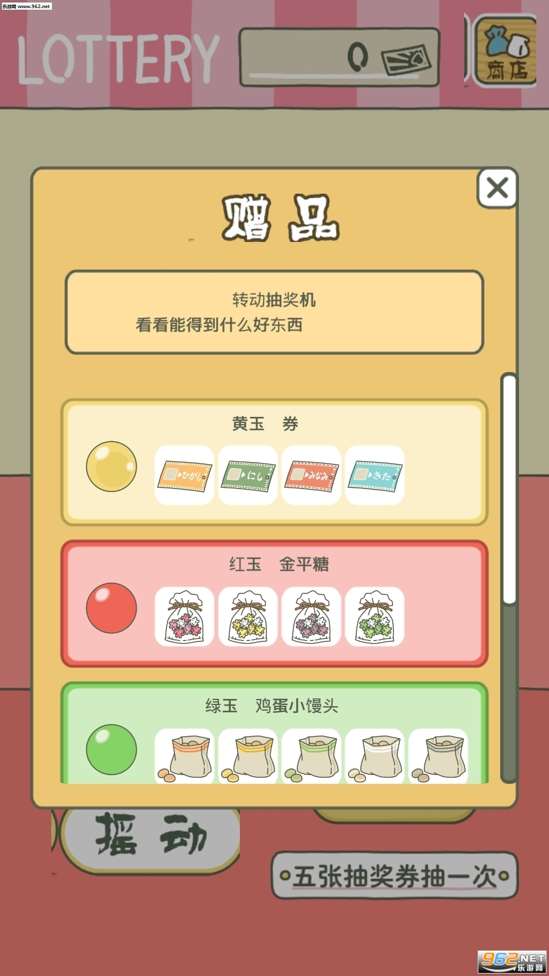 6、商店右上角还有万恶的【抽奖】,5张券来一发,奖品内容见图。抽奖券可能由蛙旅行带回,朋友也会寄来,购物时还会随机掉落。