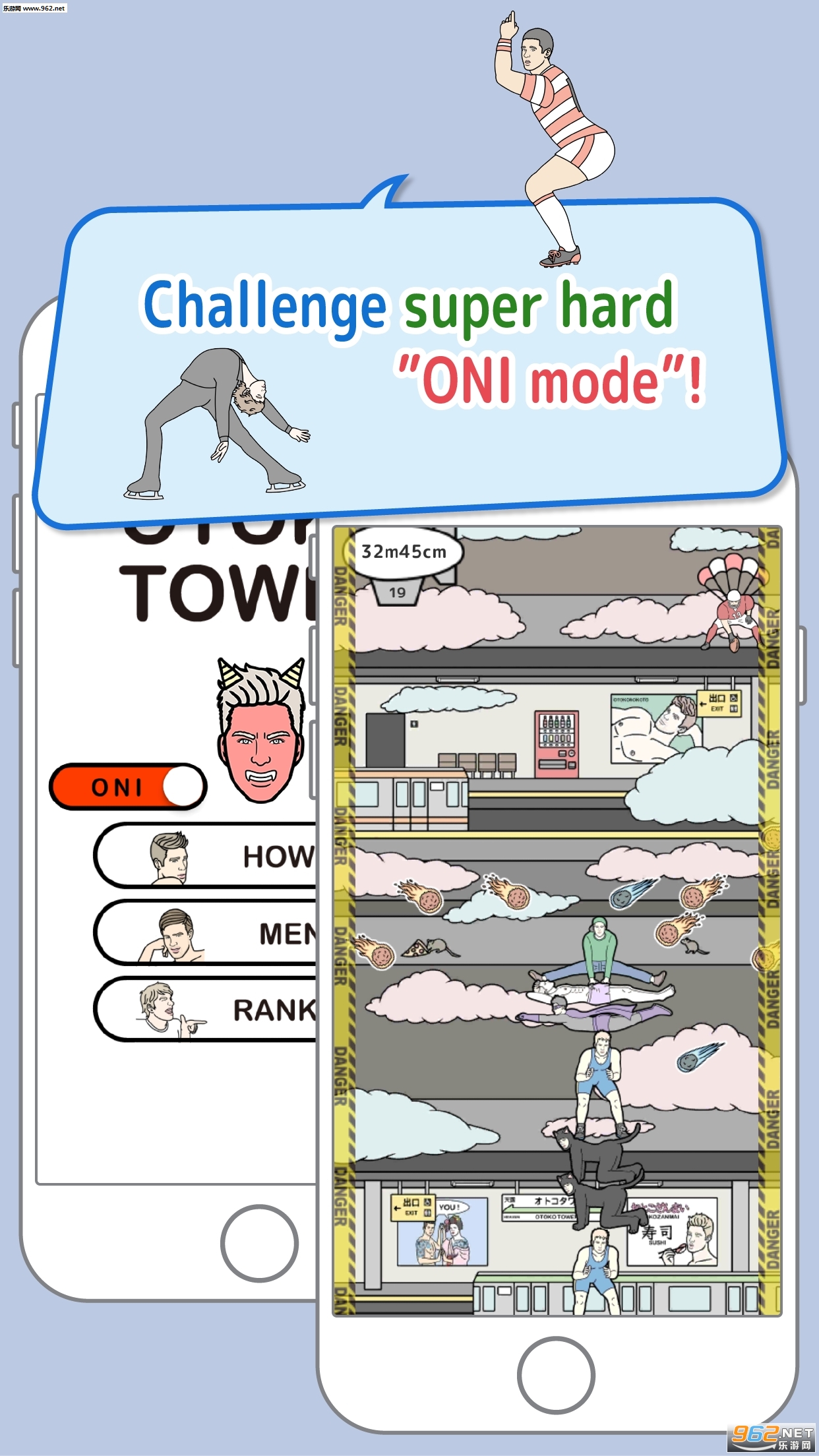 《男塔 OTOKO TOWER》是一款叠叠乐类型的游戏。游戏非常的gay里gay气,特别的骚气,首先将第一个人放在基地上, 从那里继续堆叠人来建立你的“男”塔。小心平衡,不要让他们跌倒。