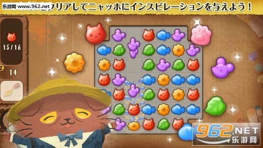 玩家可通过“三消”玩法,消除画面上的方块来帮助喵保完成他的绘画作品。