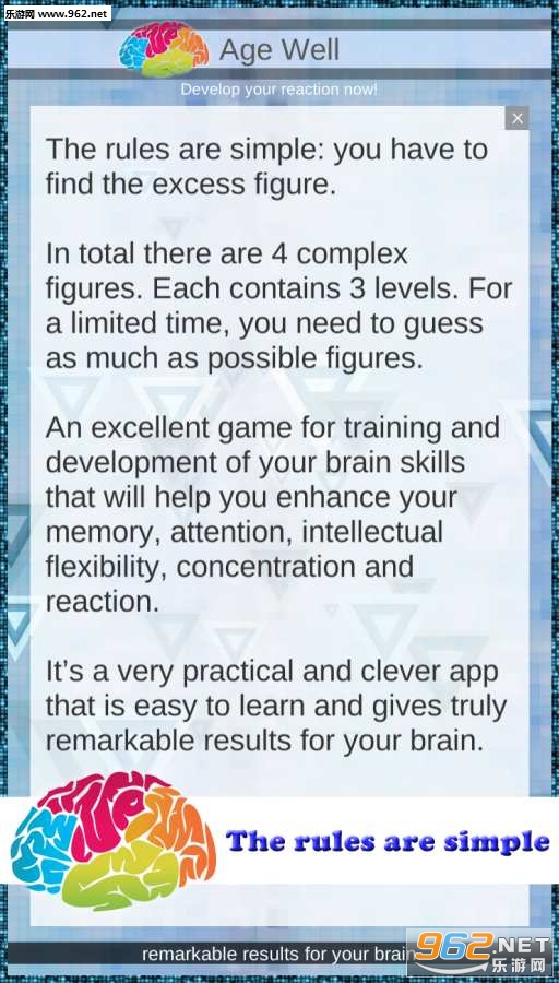 这是一个能极佳训练并开发你大脑的游戏,有助于提高你的注意力,智力与灵活性,精神集中与反应力的游戏。
