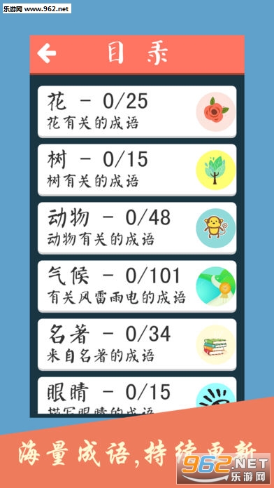 《成语大会飞花令安卓版》包括了上千条成语。根据描述事物的不同将成语分类,请你将成语连起来。成语飞花令,将连线游戏和古文知识结合起来,寓教于乐,老少皆宜。快来试试你的语文功底吧。