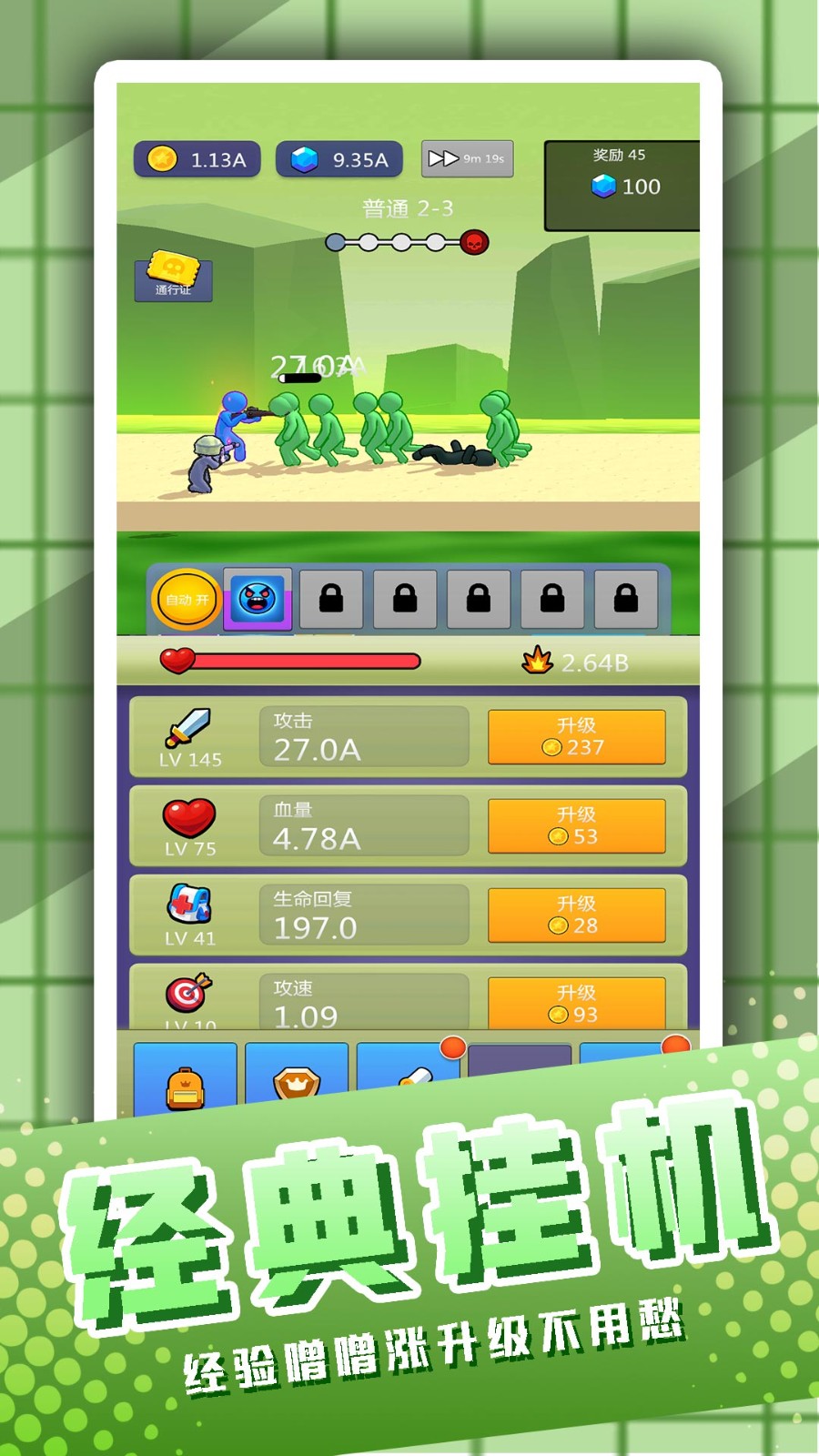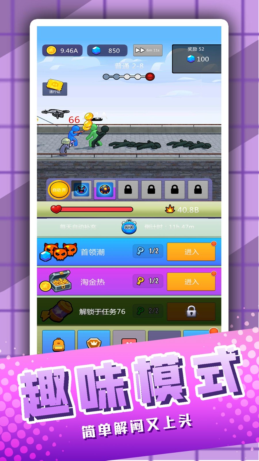 一冲飞天火柴人一款现代战斗射击游戏,玩家需要操控火柴人进行各种射击挑战,击败boss还会获得丰厚的游戏奖励,解锁更多装备道具供你使用,让你可以在这里玩得过瘾,而且游戏玩法模式非常丰富,玩家可以自由选择炫酷枪械和火柴人皮肤,享受游戏带来的欢乐。