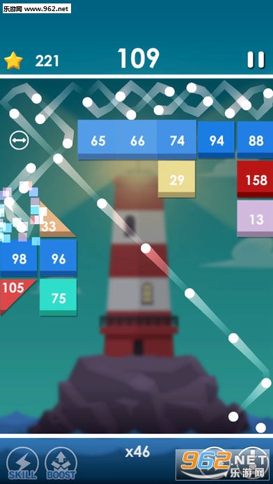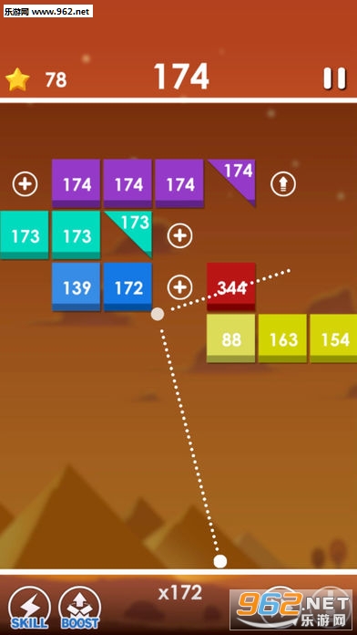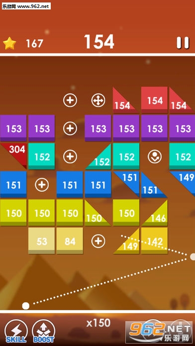 简单的打砖块游戏,游戏的规则很简单,玩家发射一次小球上面的砖块就会往下移动一点,直达方块下落到水平线游戏就结束了,玩家要竟可能多的消除砖块,获取最高积分。
