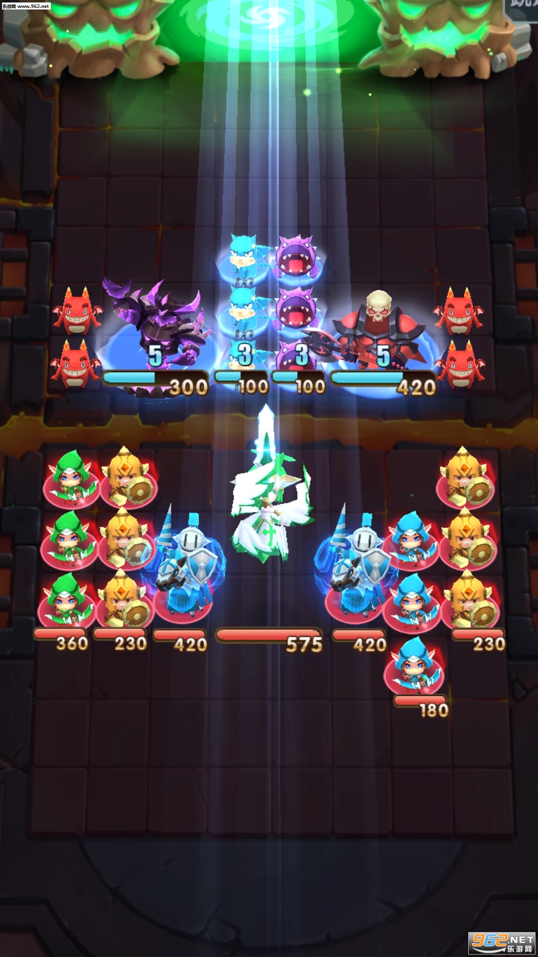 在同一列里有5个绿色弓箭手,其中的3个已经组成了一个攻击队列,另外的两个绿弓箭手则没有起到作用,但是此时如果再在拖一个绿色的弓箭手在第一列的最下方,就会和那两个没合成的绿弓箭手形成新的攻击阵列。而在同一列里合出了两个同款同颜色的兵种,则会触发融合攻击条件,此时会出现的融合攻击画面。