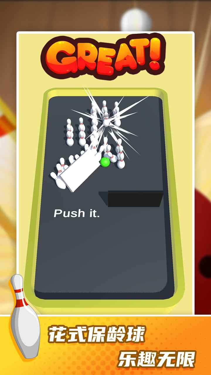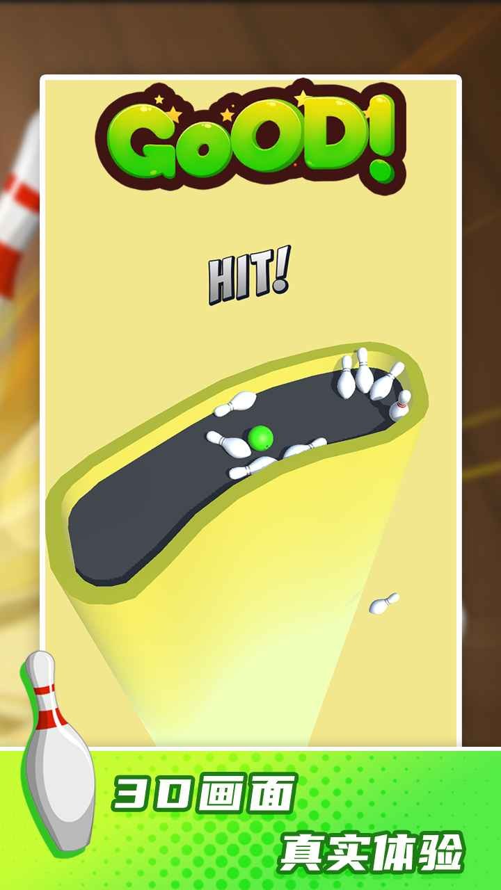 1、玩家通过滑动手指来控制保龄球的滚动轨迹,力度和击球时机。