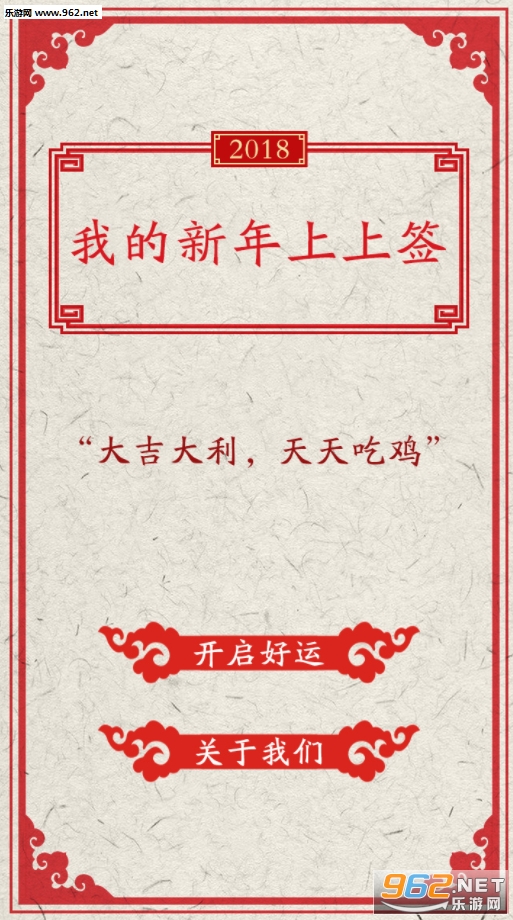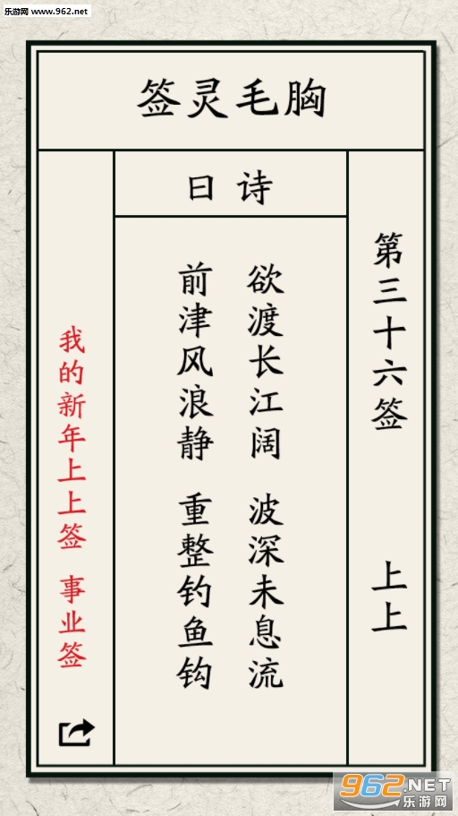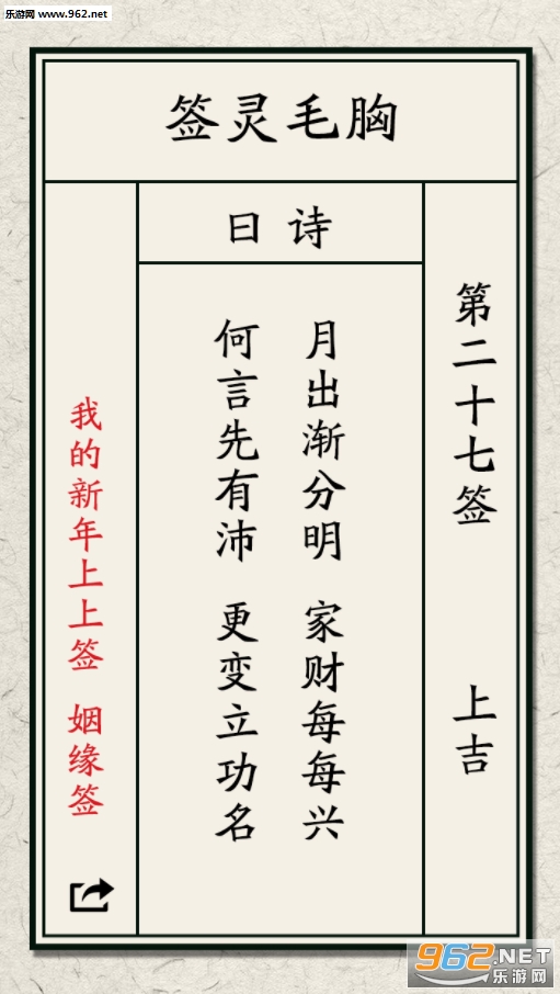 一款文字风格的休闲游戏,随着春节的即将到来,相信你一定对自己未来的一年充满了向往和盼望,这款游戏能够为你提供随机性的占卜签,从里面抽一个上上签,让自己新的一年好事连连。