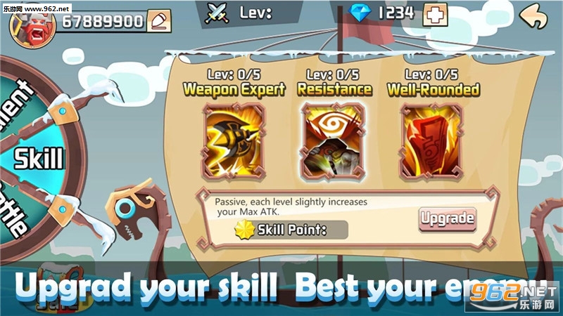 游戏的操作是十分简单的,让玩家可以很快的上手游戏,参与到游戏中来!而且在游戏中,根据升级的时候,会出现众多随机的技能,所以每一个维京人升级的方式不一样,会产生不同的战斗效果哦!