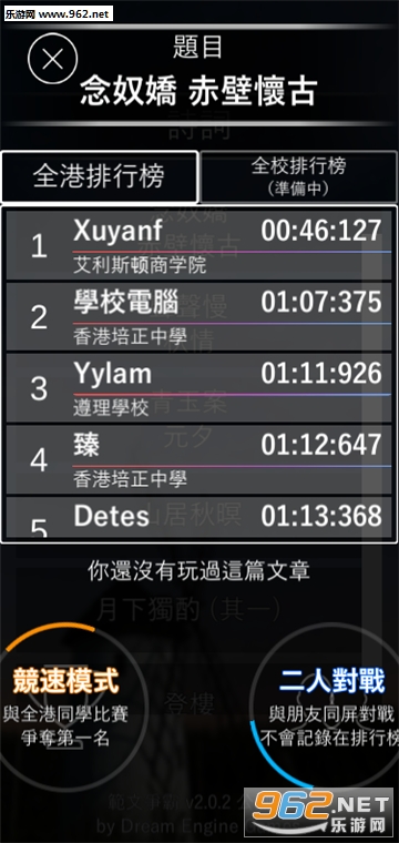 玩游戏也能学习的咯?小编进去和别人竞赛的时候真的是一脸泪了,差不多全部都还给老师了。游戏里的范文收录的是香港中学考试,虽然为繁体字,但对体验没什么影响的。游戏玩法简单,乐友学霸们,比比看吧。