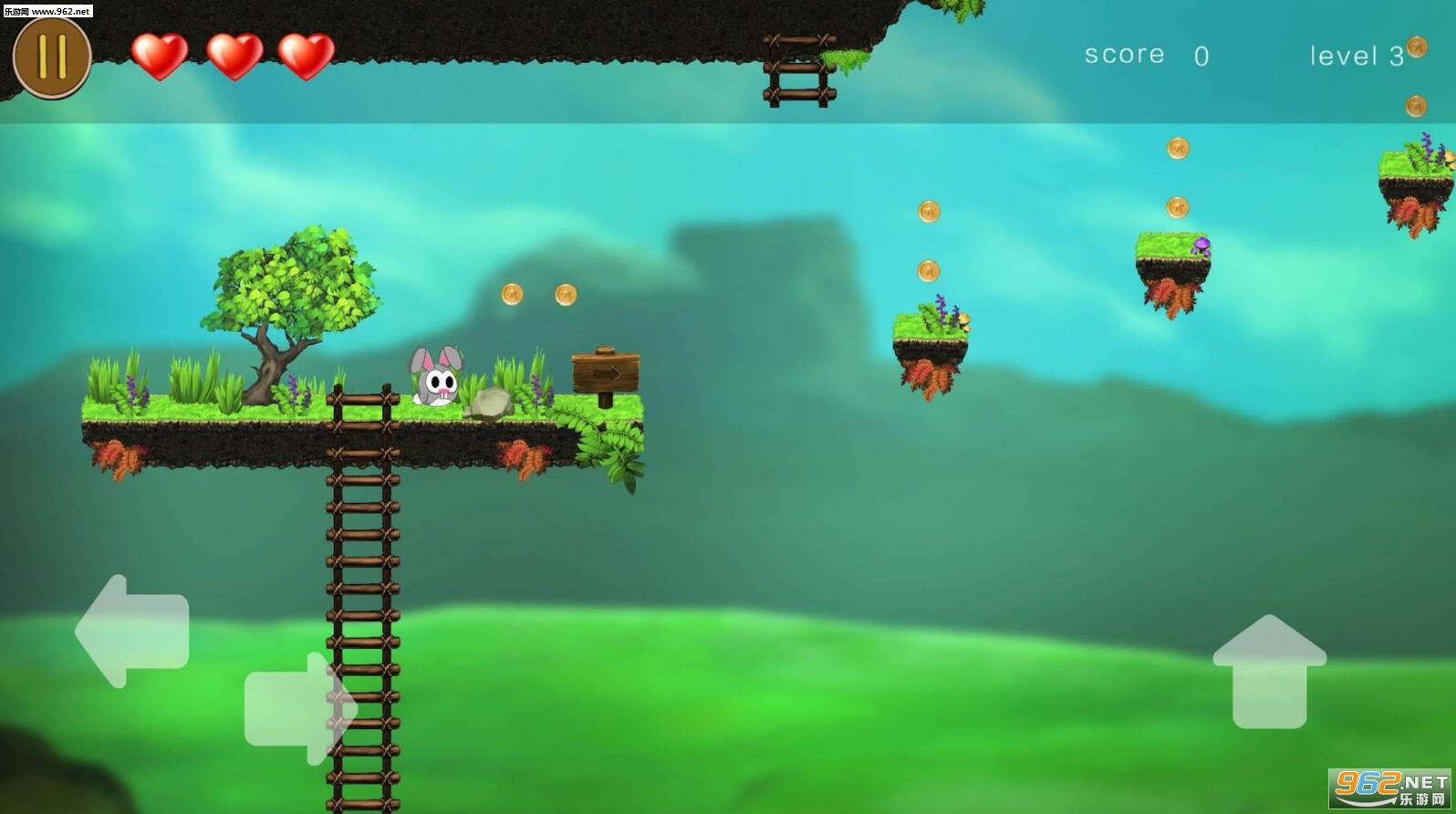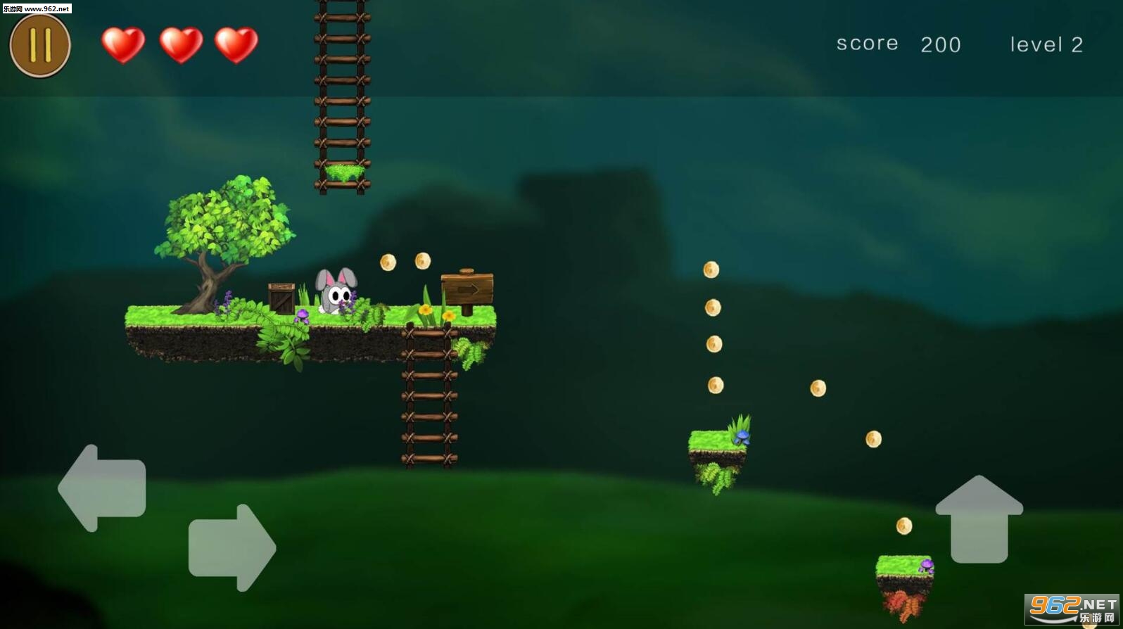 一款冒险闯关游戏,游戏中,玩家扮演一只可爱的萌兔,独自去闯金币岛的黑森林,途中会有很多障,玩家需要跳跃障碍的同时,收集金币,获得积分,完成闯关。