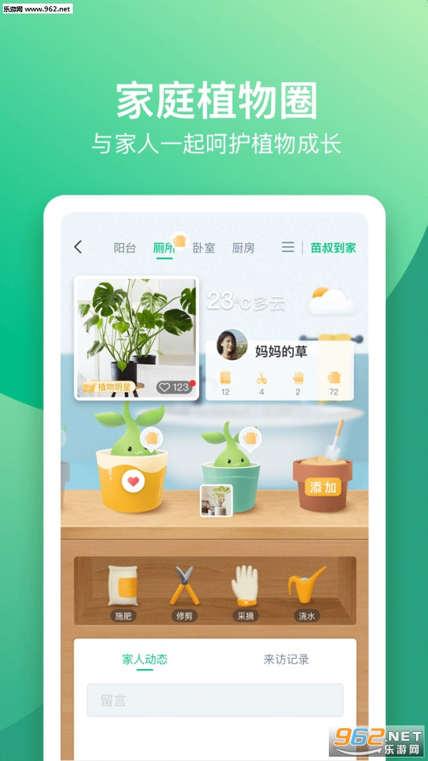 1、若是您热爱绿色家庭生活,在苗叔app这里,您可以上传家中的绿植成员,和家人一起共同呵护这些绿色小生命。您还可以将这个城市中其他的绿色生命带回家,增添更多的绿色成员。