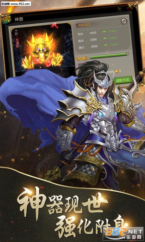 第二天免费领取:悍将吕布、绑元*900、10万金币*3、坐骑培养丹*30、神器碎片*10、6阶·血饰碎片;