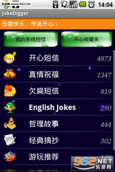 开心挖土机平台内设有“开心短信”、“节日祝福”、 “欠扁短信”、等十个频道栏目;