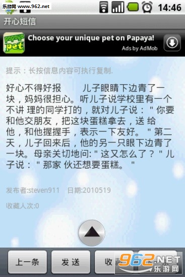 非常好用的信息分享应用,设置了开心短信、节日祝福等多个频道,用户可以通过喜欢的信息收藏到手机端,并分享转发给好友,有需要的朋友赶快来下载吧!