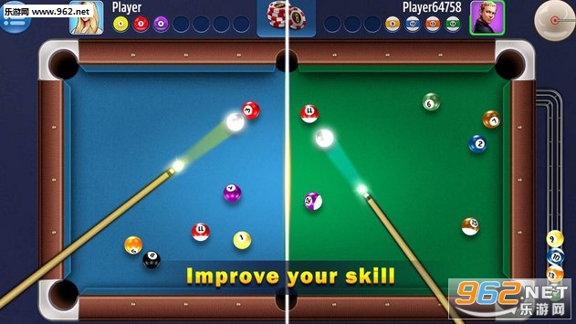 1)VS模式:玩家与电脑/玩家(有规则)进行标准的8球规则或9球规则比赛。触摸屏幕调整方向,并拖动球杆。