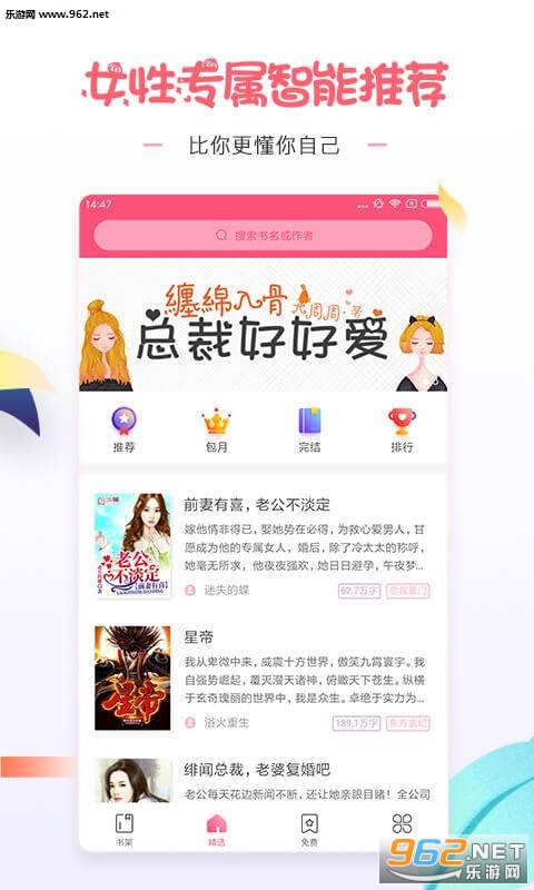 囊括知名女频作家,收录数十万知名女频书籍,涵盖言情、穿越等各大女频分类。书籍种类繁多,开阔女性阅读视野,不仅仅关注梦想,在生活经验、人文精神等智慧层面给女性更多关照。
