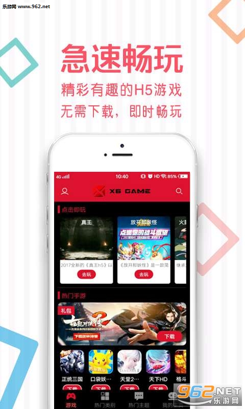 《X6Game app官方版》是一款游戏运营平台软件,软件中聚集了各种手游和H5游戏,玩家可以在这个平台上进行游戏的下载,玩耍,超多玩家实时在线,可以对战,可交流,玩法非常的丰富多样,喜欢玩游戏的玩家千万不要错过,快来下载吧!