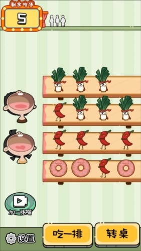 1、通过点击屏幕让跺脚的辣椒掉落,合理放置,让吃货迅速将它们吃掉。