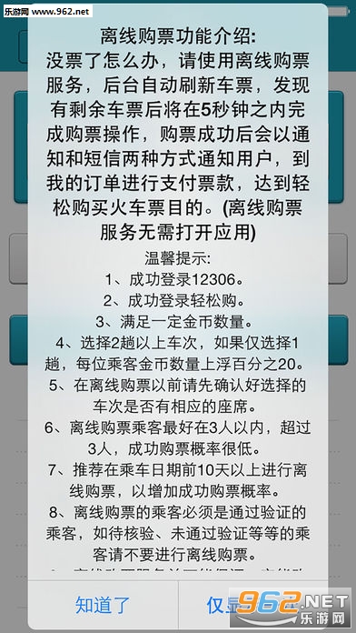 独家支持离线抢票功能,从此摆脱从早到晚在电脑前刷票的烦恼。(使用离线抢票服务应用无需开启)购票成功后,短信 + 系统通知(双保险)通知用户尽快支付票款。