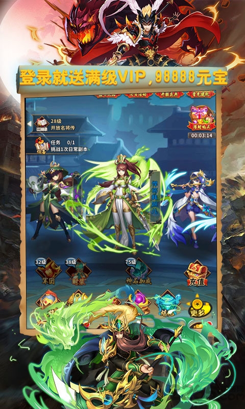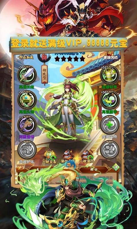 ·上线福利:上线送满V(VIP17)、元宝98888、铜币188W、体力100