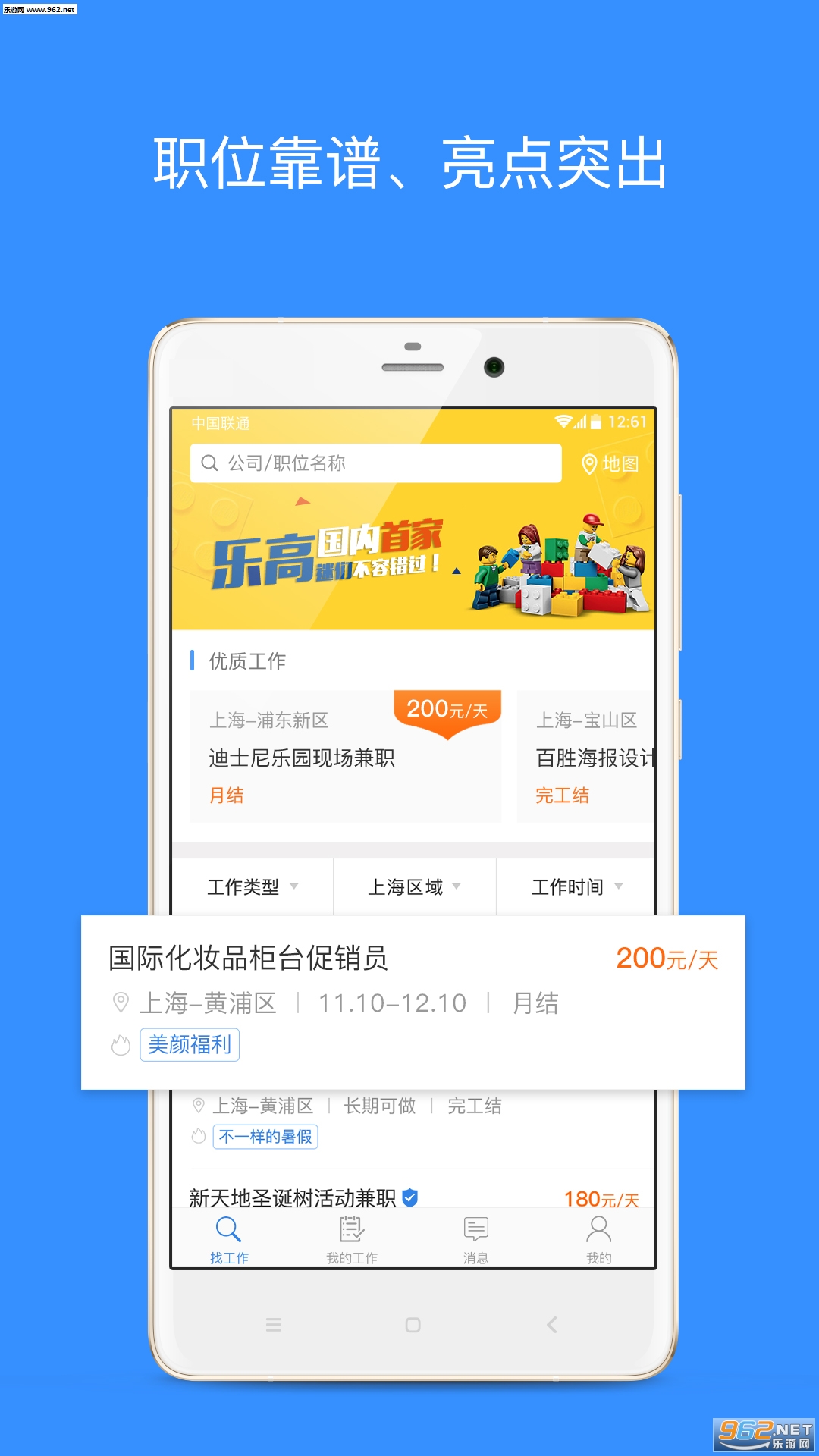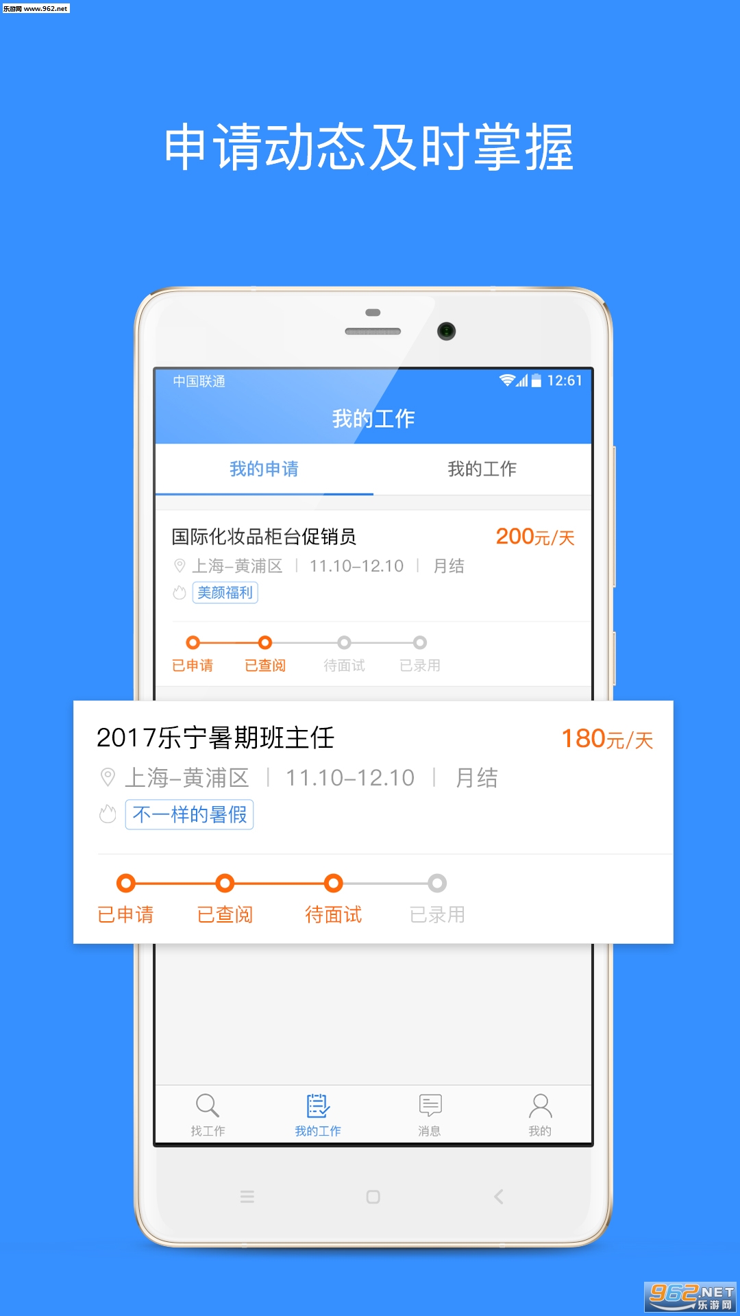 来吧,与众不同的你!这里各类优质靠谱的实习兼职机会,总有一款适合你。新职位及时提醒,申请动态时时更新,让你不错过任何一个大好机会。每份工作的报班,开启贴心的日历模式,一目了然;薪资单清晰,发放状态即时掌握,再多的RMB都不怕错啦。让彩虹般的人生,在乐业天空绽放!
