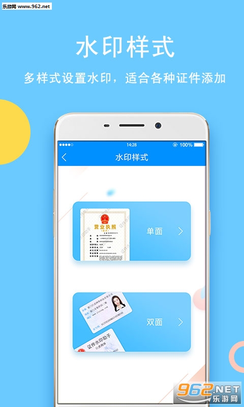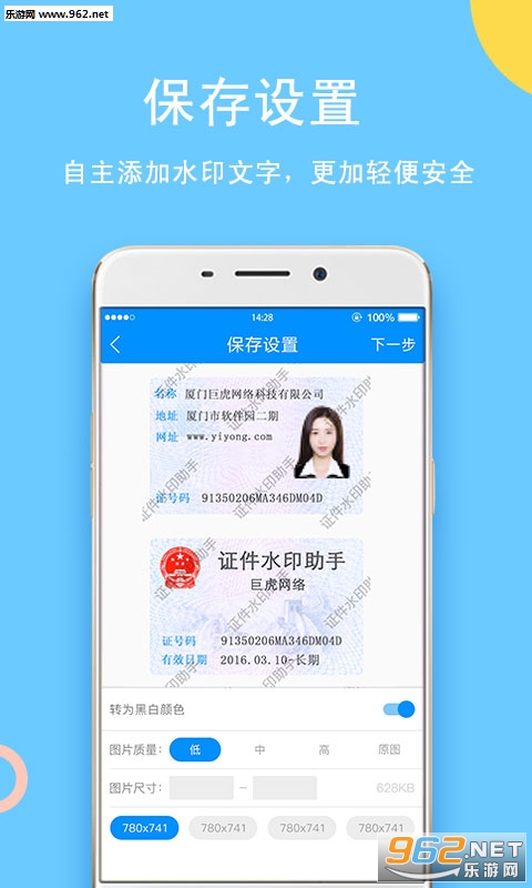 《证件水印助手app》是一款专门针对证件打水印的软件,可以很方便的给你的身份证,营业执照等等证件打上水印,限制证件的用途,避免盗用。