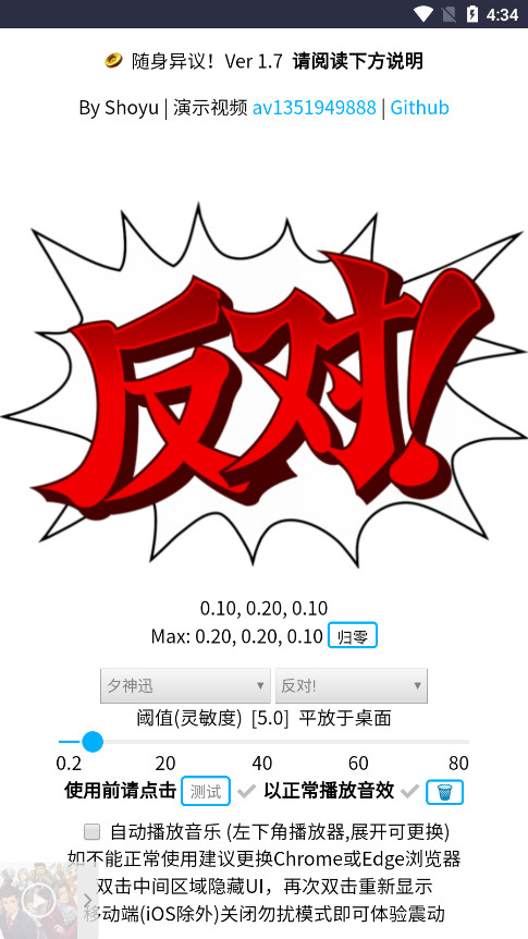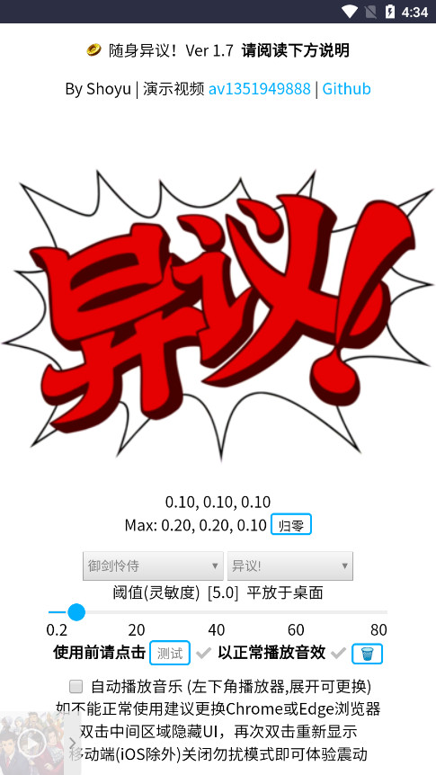 近日有玩家发现一个有意思的网站 “随身异议”,打开网站调整好灵敏度后,可以通过将手机平放在桌子上拍桌,或手持手机挥手等方式发出《逆转裁判》“异议!”的声音,可自定义角色和中日英三种语种。感兴趣的玩家可以试试。