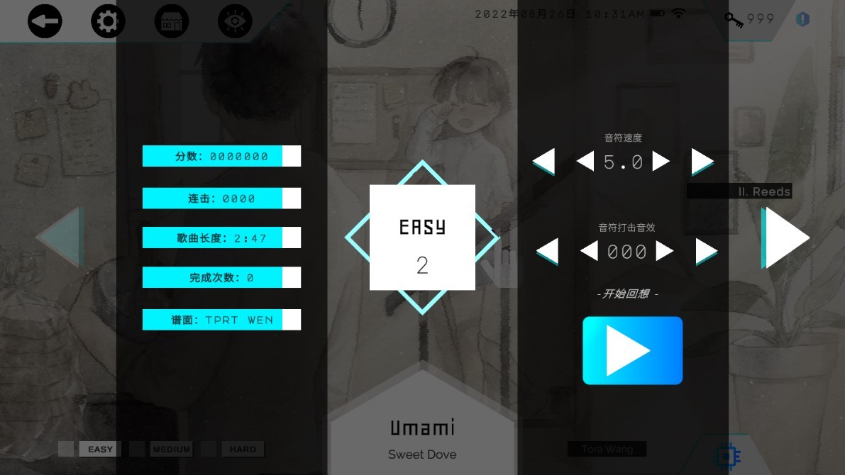 2、游戏的每个曲目提供3种难度和9个速度档,玩家可以根据自己的实际情况来调解,刚开始玩不适应的话可以调解简单点的,后期可以增大难度。