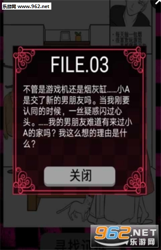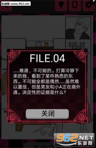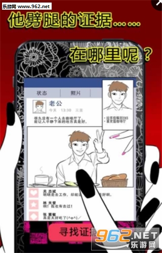 一款另类的文字剧情解谜推理类游戏,游戏采用闯关的方式,玩家需要找出关卡中自己认为出轨的4个证据,进行闯关,玩法搞笑,趣味性十足,快来下载吧!