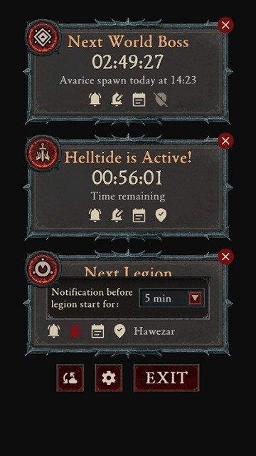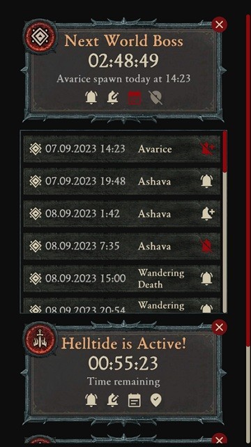 借助我们的应用程序,您可以跟踪游戏中的所有重要事件,无论是每天生成四次的世界 Boss、持续一小时的地狱潮汐,还是每 30 分钟出现的军团事件。