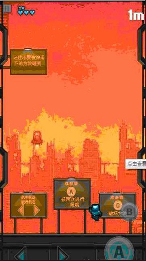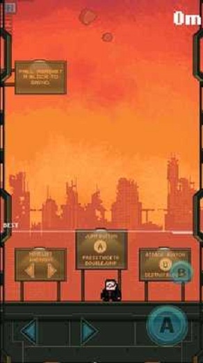 本作的画面采用像素风格,十分有老式掌机的感觉!游戏背景设计为一座即将毁灭的城市,游戏的主角为一个蓝色的小人,虽然看不清面容,但弹跳力倒是十分的强悍!背景音乐设为很激情的动感乐,整体玩上去很有刺激感。游戏操作流畅,画面感十足,不得不说这款游戏值得称赞!