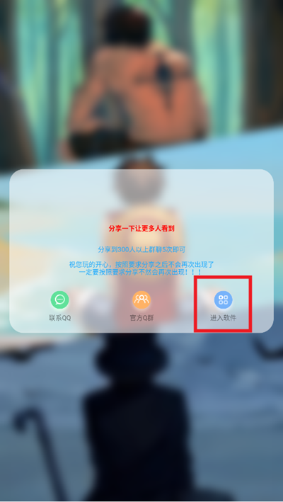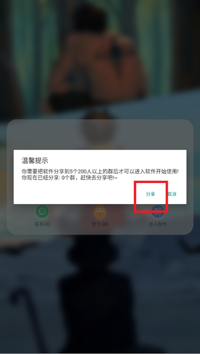 进入点击进入软件,然后点击分享,将软件分享到5个200人的群后,即可使用
