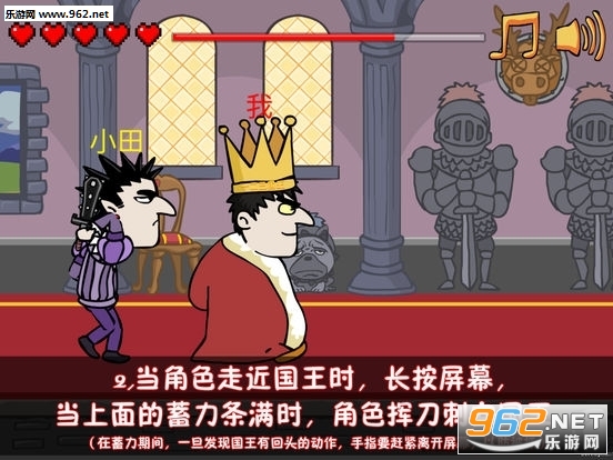 3.身为刺客,行刺时被国王抓住,心会少一颗;身为国王时,在刺客举起刀行刺时及时点击屏幕回头,就有很大几率抓住刺客。