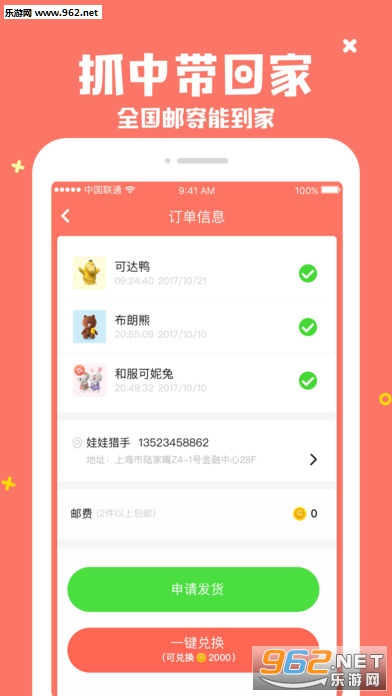 只要你抓到两件或以上的娃娃,我们就会为你包邮寄到指定地址,一件也是会发货的哦。