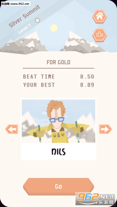每个关卡中都有目标用时,要想获得金牌,你还需多加练习才行。另外,每一个新场景的解锁,都需要你在挑战前一座山时,所有的关卡都能够获得铜牌以上的成绩。随着游戏的不断进行,除了主角LARS之外,当你完成特定的挑战目标,还将解锁出新的人物,在一定程度上减轻你的视觉疲劳。譬如,在第三关获得所有的玩具,你将解锁出新的人物NILS,又或者通过白银峰第九关你将解锁出KIM等。他们除了外观上的不同之外,其滑雪时留下的轨迹也各不相同。