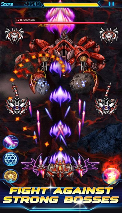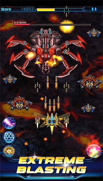 2、收集能量晶石,激活特殊技能,如护盾、追踪导弹、全屏轰炸,逆转战局;