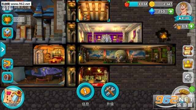 这个是城堡主界面,可以看到,基本是仿避难所模式的,大厅的圆桌可以进行整个城堡房间的排布,但也有自己独特的卡通风格,游戏音乐也很赞