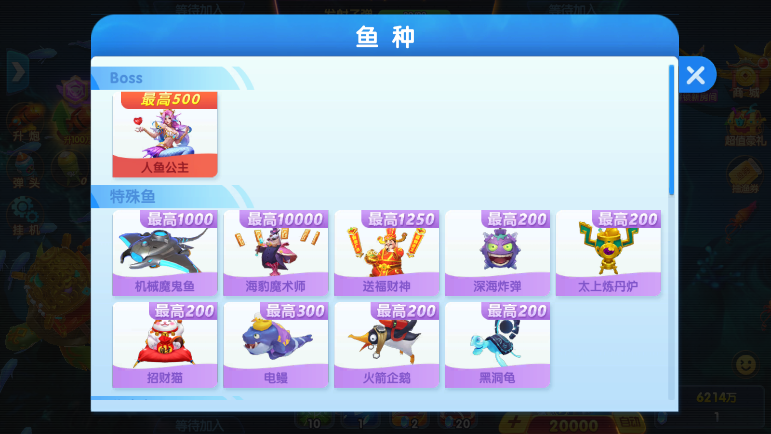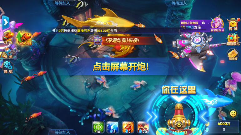 可以解锁更高倍数的炮台,在捕鱼中,炮台的倍数越高,钓到高级鱼和BOSS的机会就越大,解锁后可以选择当前使用的炮台,合理选择可以节省金币,根据目前游鱼的大小,调整合适的炮台即可,在经典模式下,每次BOSS到来,全屏都会出现提示,BOSS奖励是金币的几百倍,击杀后可以获得钻石。