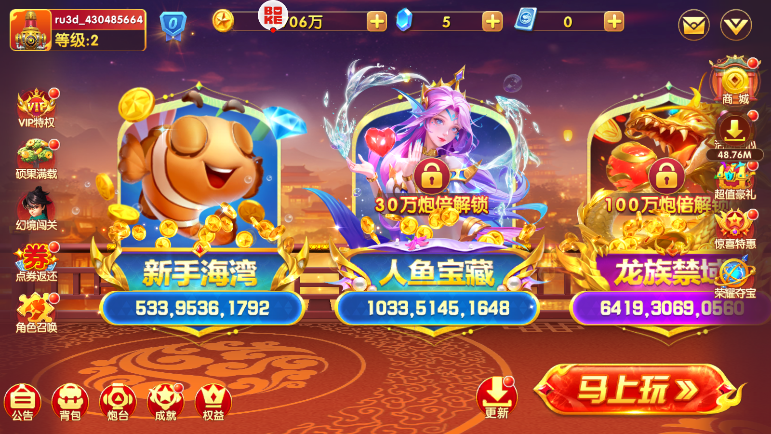 但是一大群鱼出现并捕捉的概率有点小,建议攻击前不要浪费炮弹,直到鱼潮出现,不必一直坚持打远处的大鱼,打不到可以考虑小鱼近一点,远一点的大鱼可以试着打几次,在捕鱼的过程中,有机会获得钻石,积累这些钻石,或者通过充值获得钻石。