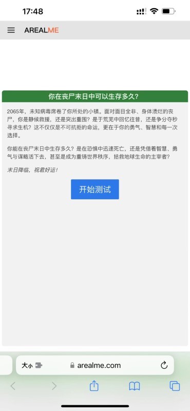 当你处于末世下,满地都是丧尸,你会做出怎样的选择呢。该测试游戏会根据不同的情况一一询问你,你只需要做出你认为最合理最适于生存的选择就可以了。