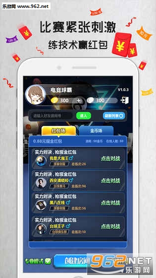 3.您可在【红包赛】赢现金;也可【创建房间】与亲朋好友约球对战;